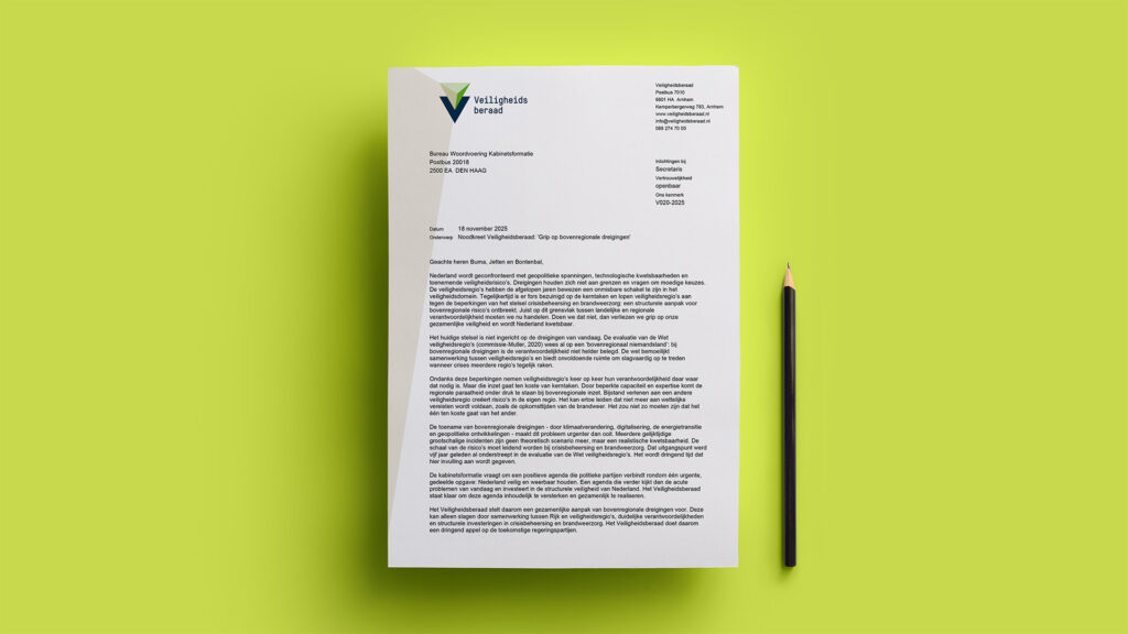 Nederland wordt geconfronteerd met geopolitieke spanningen, technologische kwetsbaarheden en toenemende veiligheidsrisico’s. Dreigingen houden zich niet aan grenzen en vragen om moedige keuzes. ‘Tegelijkertijd is er fors bezuinigd op de kerntaken en lopen veiligheidsregio’s aan tegen de beperkingen van het stelsel crisisbeheersing en brandweerzorg’, stelt voorzitter Hein van der Loo van het Veiligheidsberaad in een open brief aan informateur Buma en de heren Jetten en Bontenbal.